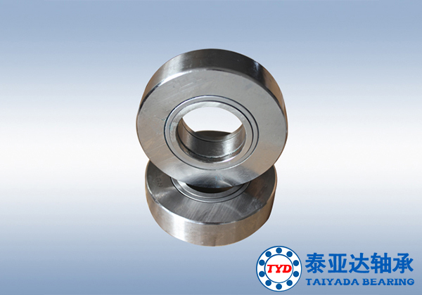 曲线滚轮轴承由一根作为滚子组内滚道的螺栓及一个厚壁外圈组成,螺栓轴的台肩及压在螺栓上的端面挡圈组成了外圈沿两个侧面方向的引导面。